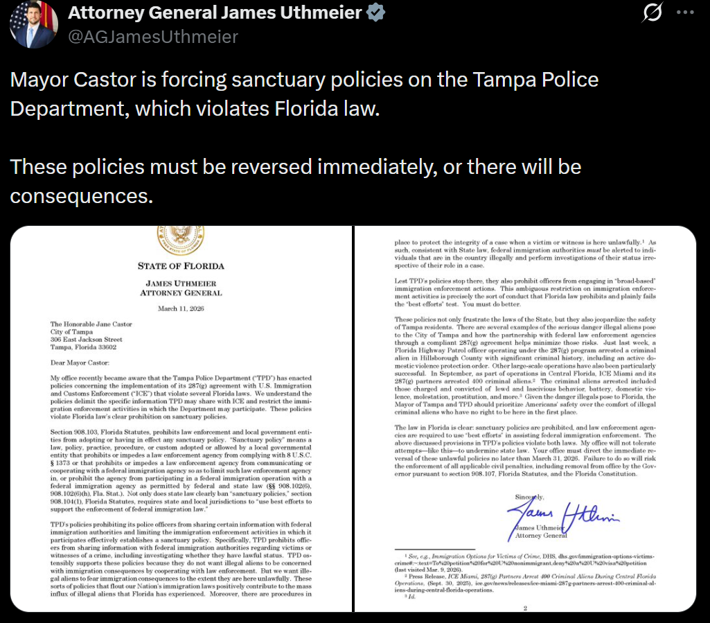 TAMPA, FL — Florida Attorney General James Uthmeier sent a letter on Wednesday threatening Mayor Jane Castor, including potentially removing her from office, for “forcing sanctuary policies on the Tampa Police Department, which violates state law,” he posted to X, adding, “These [immigration] policies must be reversed immediately, or there will be consequences.”